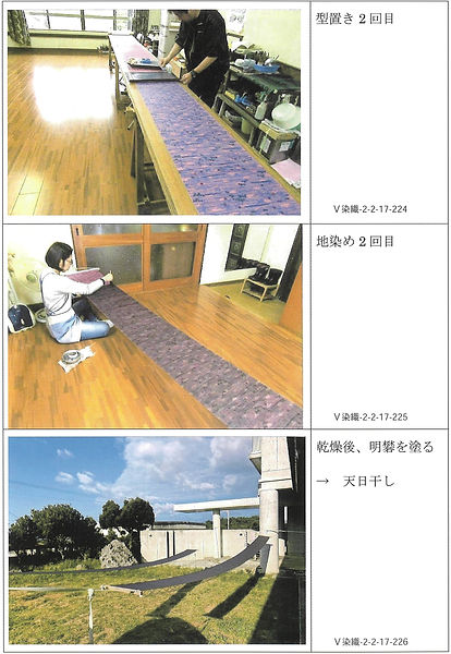 この衣裳の裏の紅型〈紫地鶴松桜霞観世水文様紅型木綿〉は、紅型〈水色地菱繋ぎに松梅楓鳥模様〉と制作手順が同じであると考えられます。報告書に、玉那覇紅型工房が試みた復元の工程が掲載されていましたので、紅型〈水色地菱繋ぎに松梅楓鳥模様〉の制作手順を考える上で非常に参考になりイメージしやすいため、これを転載させていただきます。
